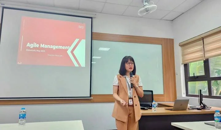 Điểm nhấn của buổi học lần này là phần chia sẻ đến từ Chị Nguyễn Khánh Phượng – Giám đốc Thị trường Global của Rikkeisoft, một trong những công ty gia công phần mềm hàng đầu Việt Nam. Với chủ đề “Practices of Agile Project Management in Software Companies”, chị Phượng đã mang đến cái nhìn thực tế và sống động về cách các doanh nghiệp công nghệ đang áp dụng Agile vào vận hành và phát triển sản phẩm.
