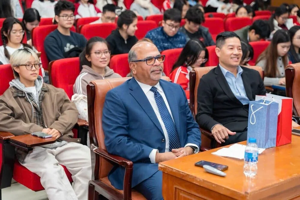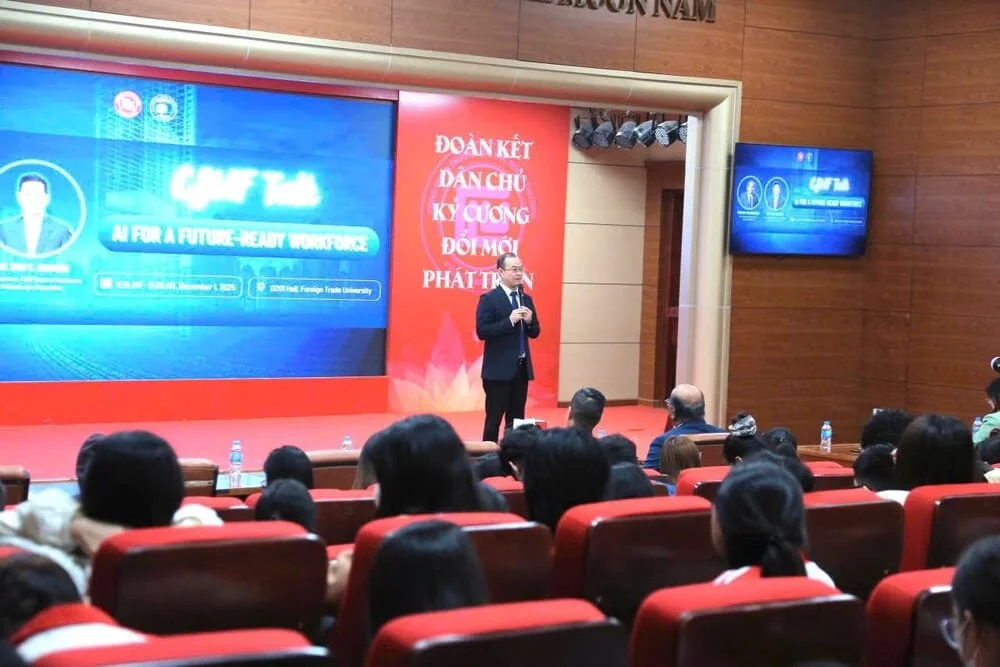 Diễn giả khách mời gồm GS.TS Sri Sundaram, Trưởng khoa College of Business and Economics thuộc California State University, Fullerton, và ông Tam Nguyen, Chủ tịch Hội đồng Quản trị Quỹ Philanthropic Foundation thuộc CSUF. Các diễn giả đã mang đến những chia sẻ chuyên sâu, trực quan và mang tính thực tiễn cao về trí tuệ nhân tạo và vai trò của AI trong việc định hình lực lượng lao động tương lai.