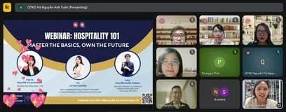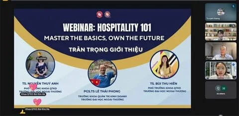 Vào ngày 17/07 vừa qua, các bạn K64 Wannabe chương trình ĐHNNQT QTKS đã tham gia sự kiện WEBINAR HOSPITALITY 10: “MASTER THE BASICS, OWN THE FUTURE” và tích lũy thêm vô vàn kiến thức bổ ích từ những lời chia sẻ của các Diễn giả. Về phía nhà trường, chương trình có sự tham gia của PGS.TS Lê Thái Phong – Trưởng khoa Quản trị Kinh Doanh, TS. Nguyễn Thuý Anh – Phó trưởng khoa QTKD, TS. Bùi Thu Hiền – Phó trưởng khoa QTKD, cùng các thầy cô và các bạn K64 Wannabe chương trình ĐHNNQT QTKS. Về phía Diễn giả khách mời, sự kiện Webinar 101 có sự tham gia của chị Lê Thuỳ Dương, Area Learning and Development Manager, PGS.TS. Nguyễn Thị Khánh Chi – Trưởng bộ môn QTKS – FTU và anh Nguyễn Quốc Hoàng – sinh viên Anh 1 K60 ĐHNNQT QTKS, Front Office Executive tại khách sạn M Village Hồ Gươm.