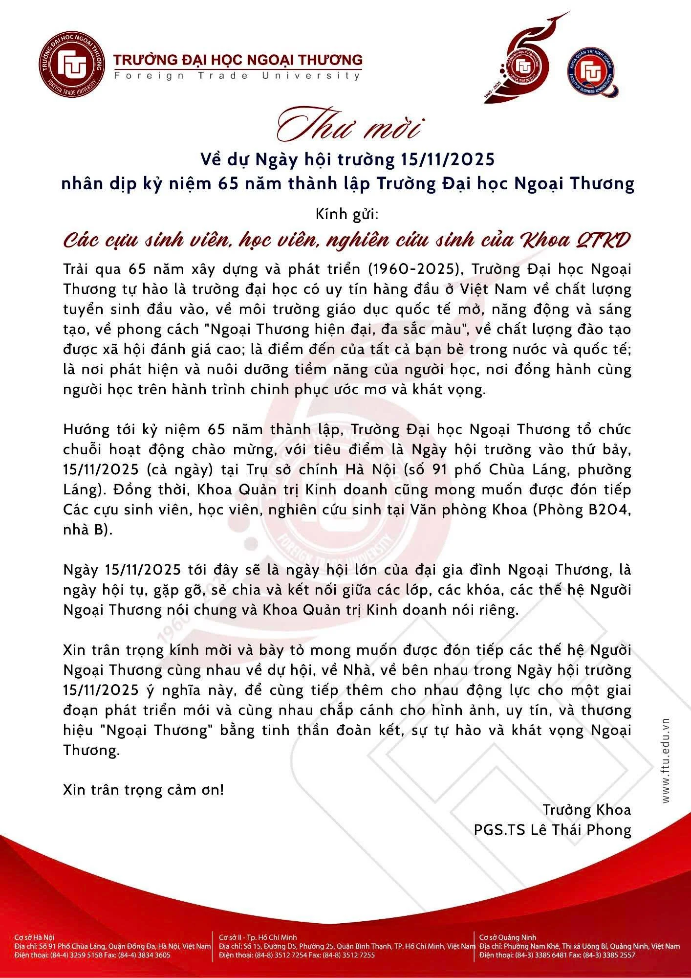 Thông báoTIN TỨC THƯ MỜI: Các cựu sinh viên, học viên, nghiên cứu sinh của Khoa QTKD về dự Ngày hội trường 15/11/2025 nhân dịp kỷ niệm 65 năm thành lập Trường Đại học Ngoại Thương. 13/11/2025 Thư mời TIN LIÊN QUAN THƯ MỜI THAM DỰ LỄ KỶ NIỆM 65 NĂM – KHÁT VỌNG NGOẠI THƯƠNG ĐẠI HỘI CÔNG ĐOÀN KHOA QUẢN TRỊ KINH DOANH, NHIỆM KỲ 2025–2030 THƯ MỜI CÁC THẾ HỆ SINH VIÊN, HỌC VIÊN, NGHIÊN CỨU SINH; CÁC CỰU GIÁO CHỨC VÀ TOÀN THỂ CÁN BỘ, VIÊN CHỨC, NGƯỜI LAO ĐỘNG VỀ DỰ NGÀY HỘI TRƯỜNG 15/11/2025 NHÂN DỊP KỶ NIỆM 65 NĂM THÀNH LẬP TRƯỜNG (1960 – 2025) [CALL FOR PAPERS] HỘI THẢO KHOA HỌC 2025 – TRƯỜNG ĐẠI HỌC NGOẠI THƯƠNG RECAP: SHOWCASE TỔNG KẾT HỌC PHẦN TƯ DUY THIẾT KẾ TIN MỚI NHẤT [RECAP] KIMSEN FACTORY TOUR CÙNG SINH VIÊN K62 CHƯƠNG TRÌNH CHẤT LƯỢNG CAO QUẢN TRỊ KINH DOANH TRƯỜNG ĐH NGOẠI THƯƠNG THƯ MỜI THAM DỰ LỄ KỶ NIỆM 65 NĂM – KHÁT VỌNG NGOẠI THƯƠNG ĐẠI HỘI CÔNG ĐOÀN KHOA QUẢN TRỊ KINH DOANH, NHIỆM KỲ 2025–2030 THƯ MỜI CÁC THẾ HỆ SINH VIÊN, HỌC VIÊN, NGHIÊN CỨU SINH; CÁC CỰU GIÁO CHỨC VÀ TOÀN THỂ CÁN BỘ, VIÊN CHỨC, NGƯỜI LAO ĐỘNG VỀ DỰ NGÀY HỘI TRƯỜNG 15/11/2025 NHÂN DỊP KỶ NIỆM 65 NĂM THÀNH LẬP TRƯỜNG (1960 – 2025) [CALL FOR PAPERS] HỘI THẢO KHOA HỌC 2025 – TRƯỜNG ĐẠI HỌC NGOẠI THƯƠNG