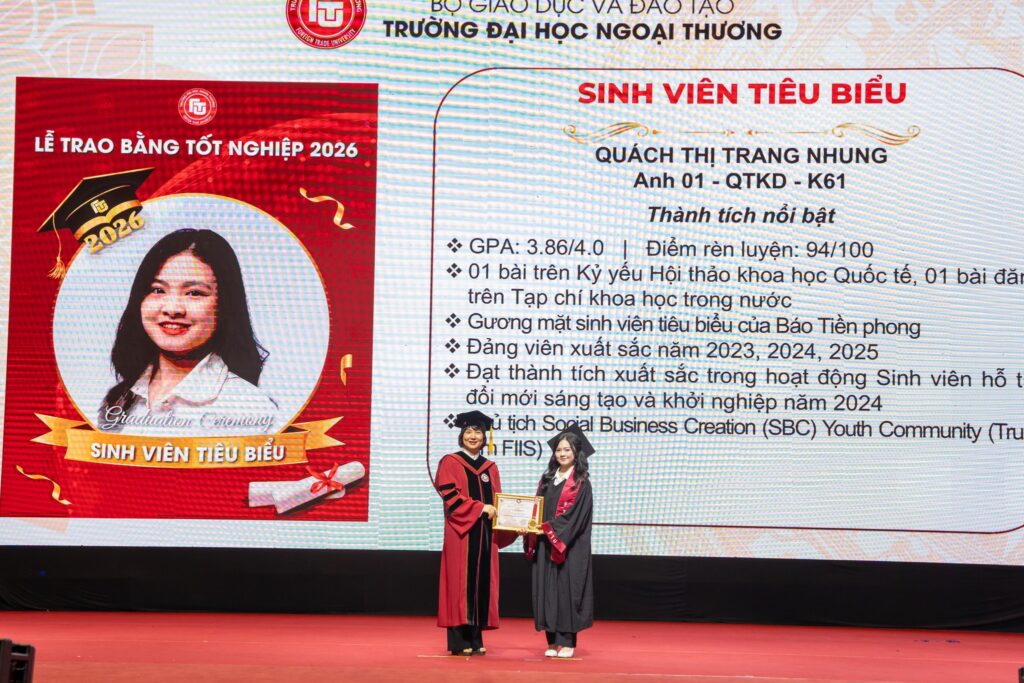 Tại Lễ trao bằng tốt nghiệp đợt 1 năm 2026 của Trường Đại học Ngoại thương, Quách Thị Trang Nhung, sinh viên K61 chương trình tiêu chuẩn Quản trị kinh doanh quốc tế, đã được vinh danh là một trong 16 Sinh viên tiêu biểu toàn khóa. Thành tích này không chỉ phản ánh kết quả học tập xuất sắc mà còn là minh chứng cho hành trình nỗ lực, trưởng thành và không ngừng khám phá bản thân trong suốt bốn năm đại học.