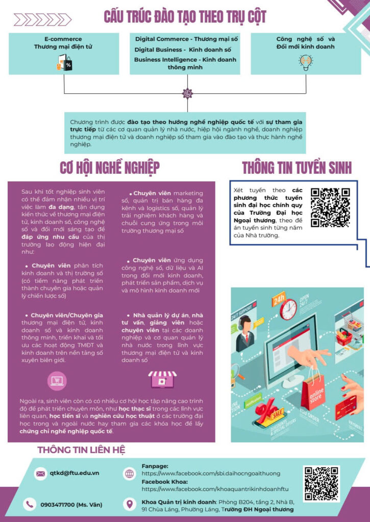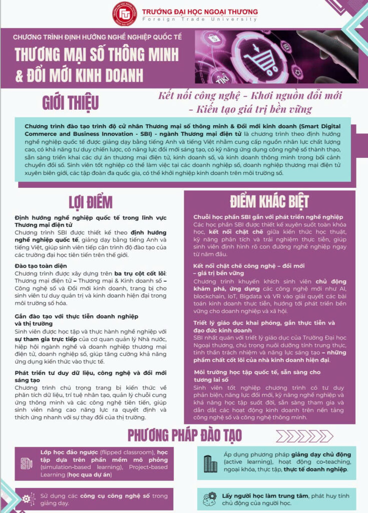 Chương trình cử nhân Thương mại số thông minh và Đổi mới kinh doanh (Smart Digital Commerce and Business Innovation – SBI), ngành Thương mại điện tử của Khoa Quản trị Kinh doanh, Trường Đại học Ngoại thương là chương trình đào tạo định hướng nghề nghiệp quốc tế, được giảng dạy bằng cả tiếng Anh và tiếng Việt. Chương trình hướng tới đào tạo nguồn nhân lực chất lượng cao, có tư duy chiến lược, năng lực đổi mới sáng tạo và khả năng ứng dụng công nghệ số trong bối cảnh chuyển đổi số toàn cầu.